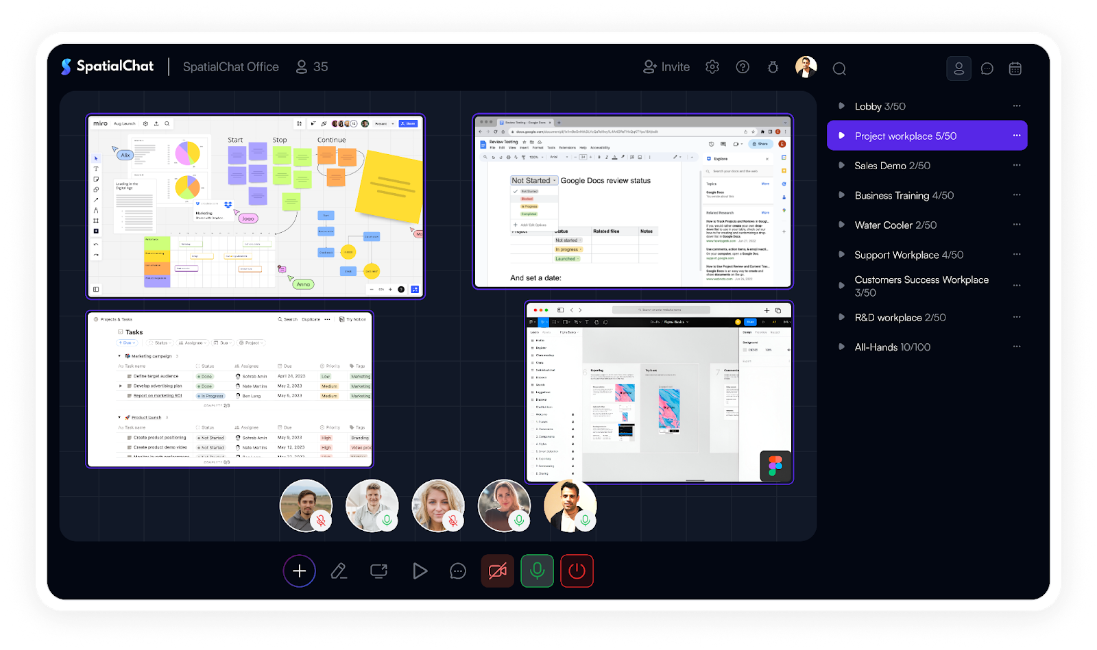 This flexibility allows teams to handle everything from daily collaboration to company-wide events in the same platform. You can share presentations, collaborate in real time on Miro boards, Google Docs, Figma, or Trello, run polls and Q&A, and even record sessions for on-demand access. Whether it’s a sprint review, staff onboarding, or a global townhall, SpatialChat is equipped to support it.
